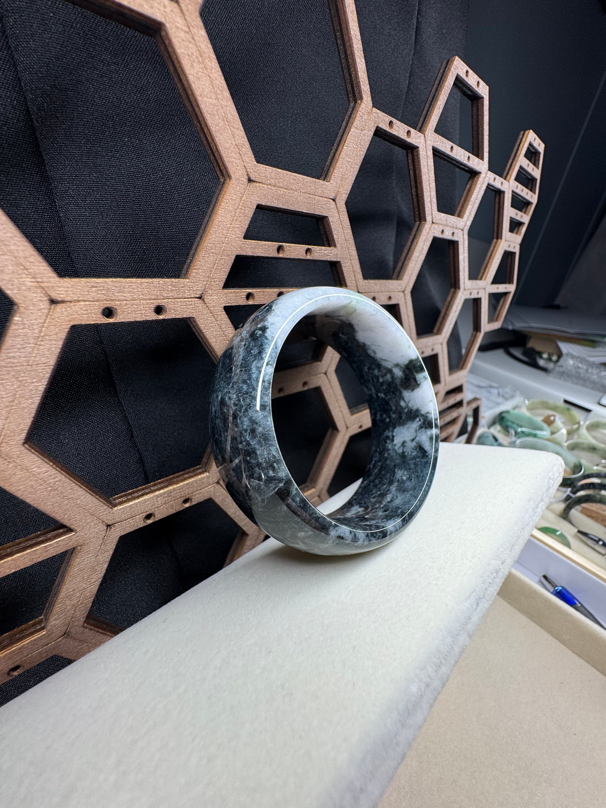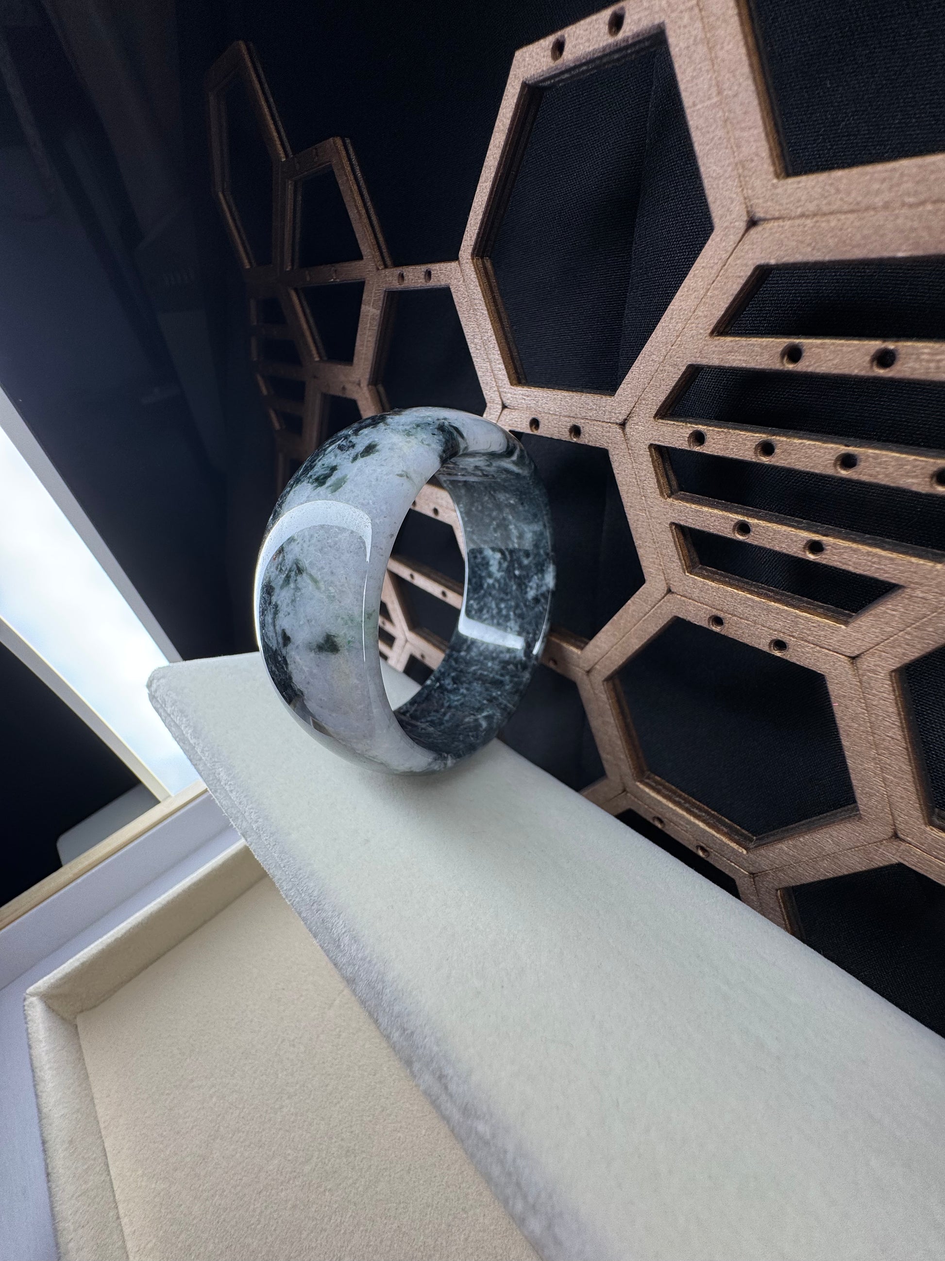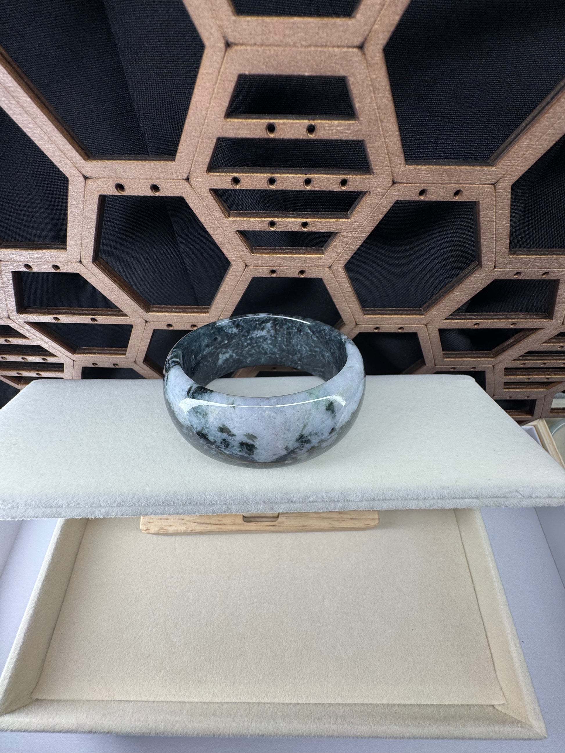This dark grey and white jadeite jade bangle has unique looks. Smooth and heavy feeling. A perfect one to add in your jewelry collection.