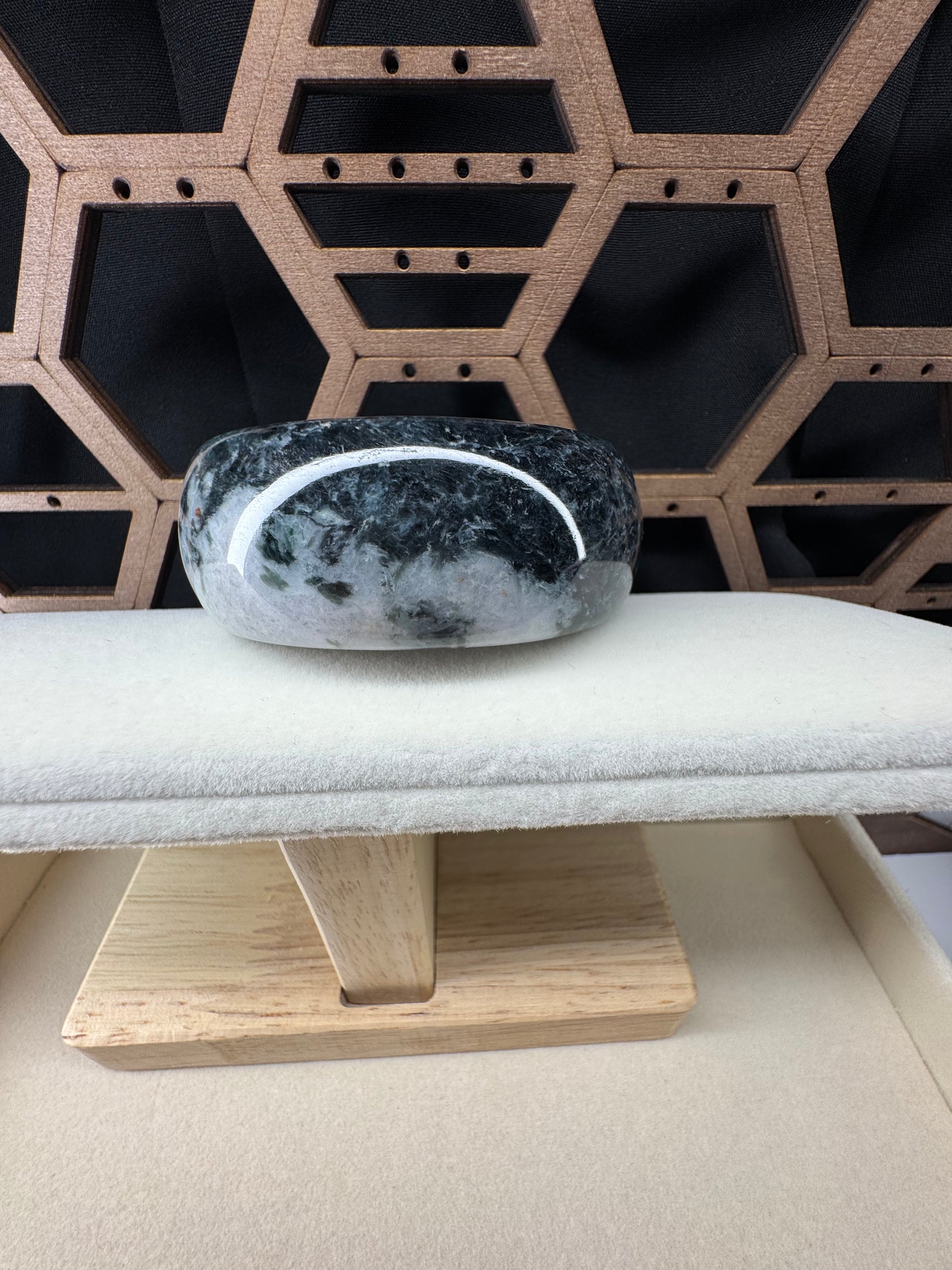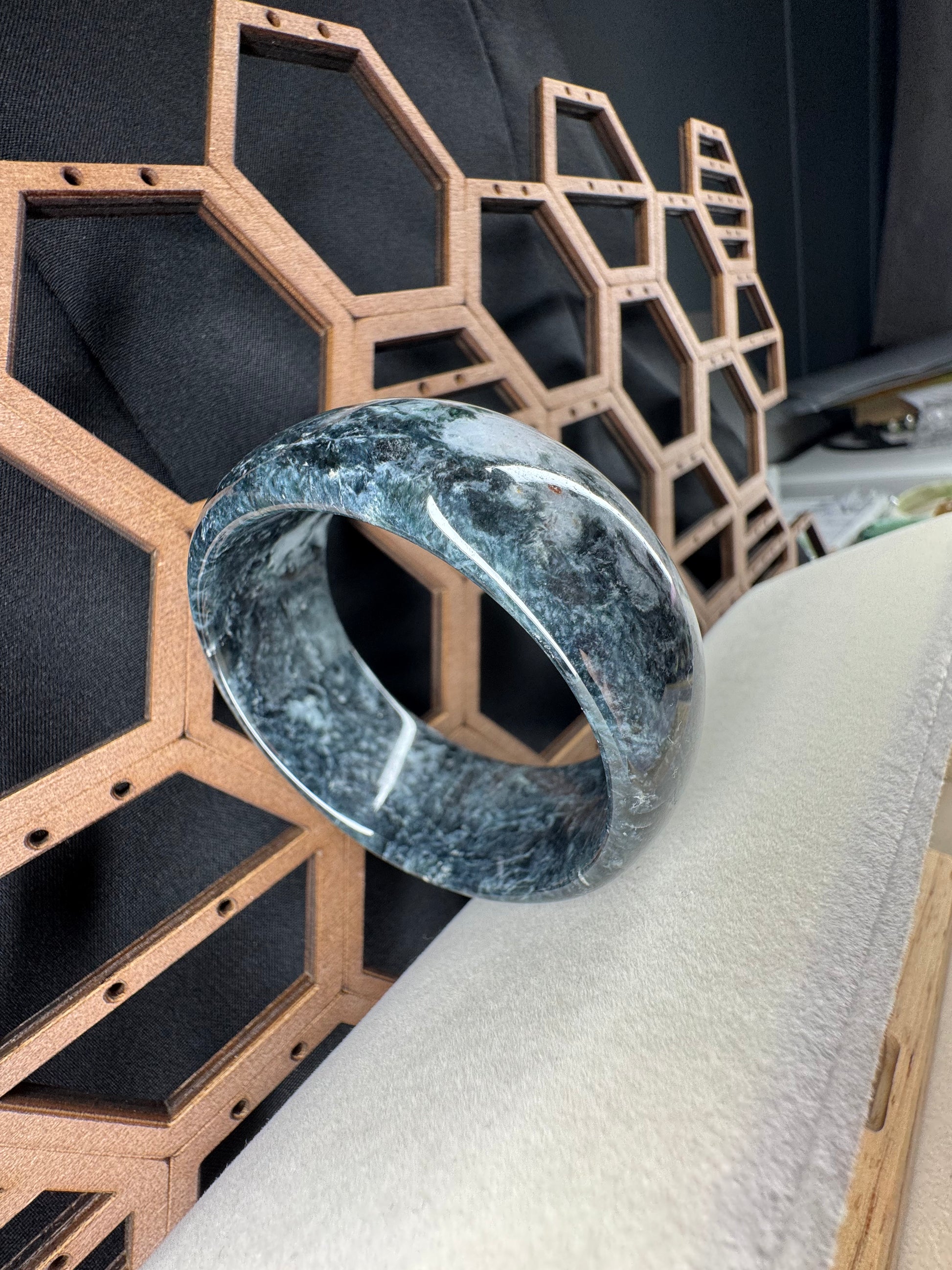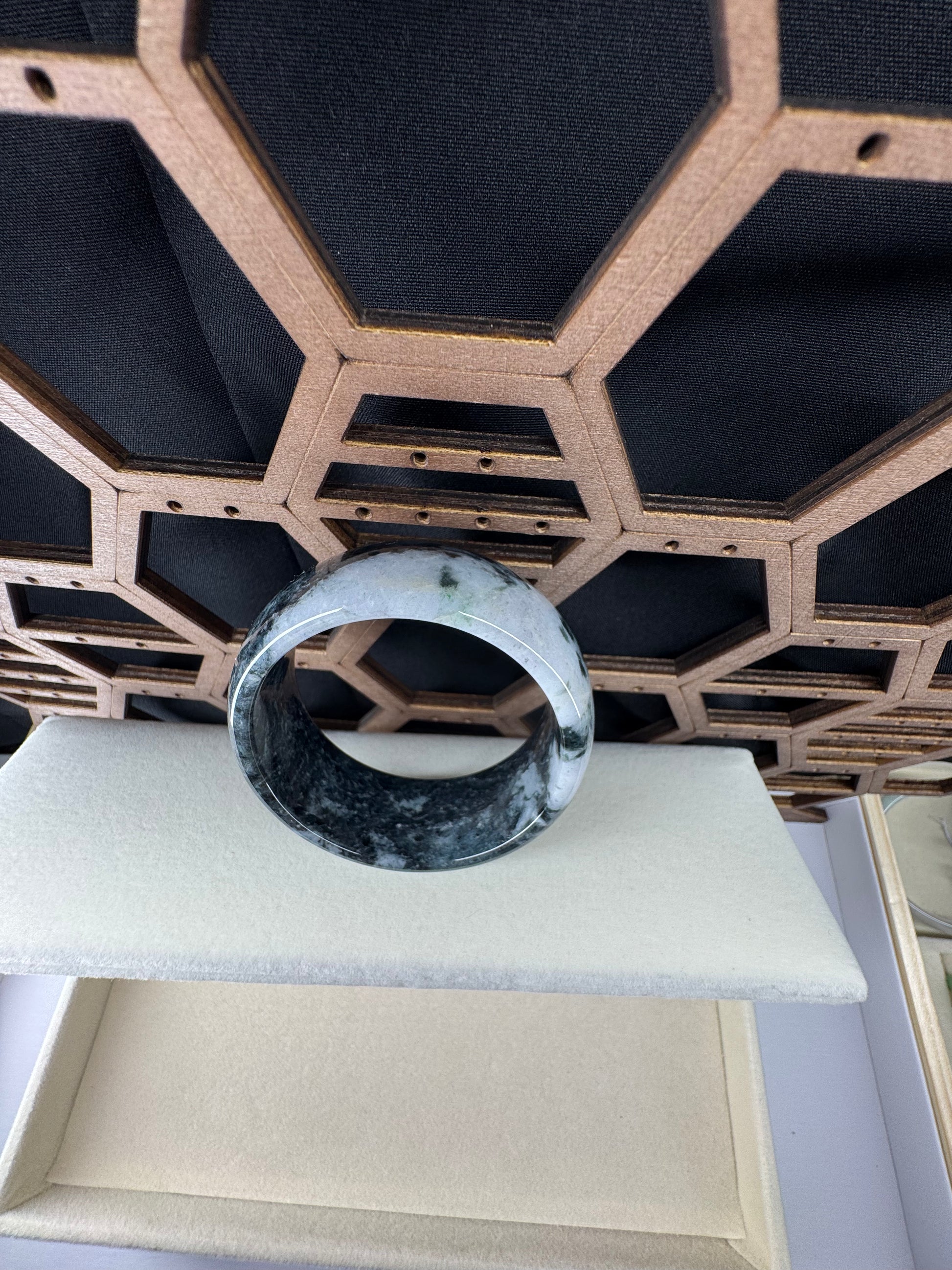 This dark grey and white jadeite jade bangle has unique looks. Smooth and heavy feeling. A perfect one to add in your jewelry collection.