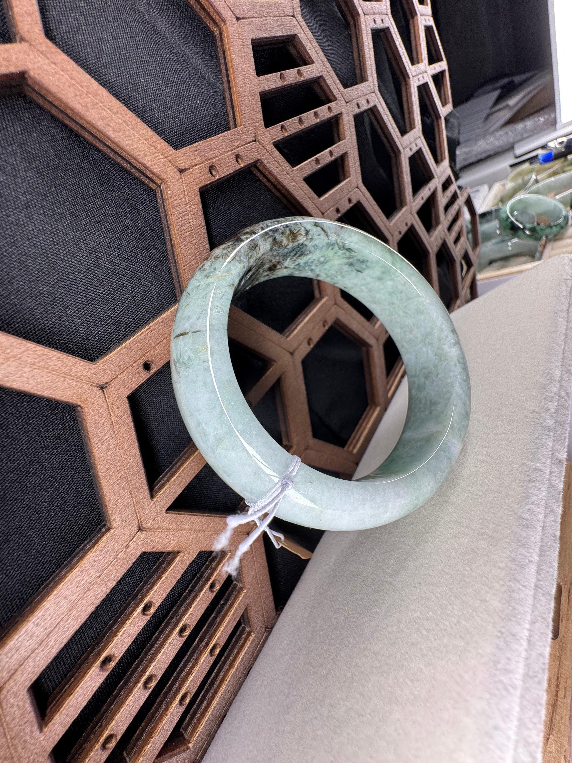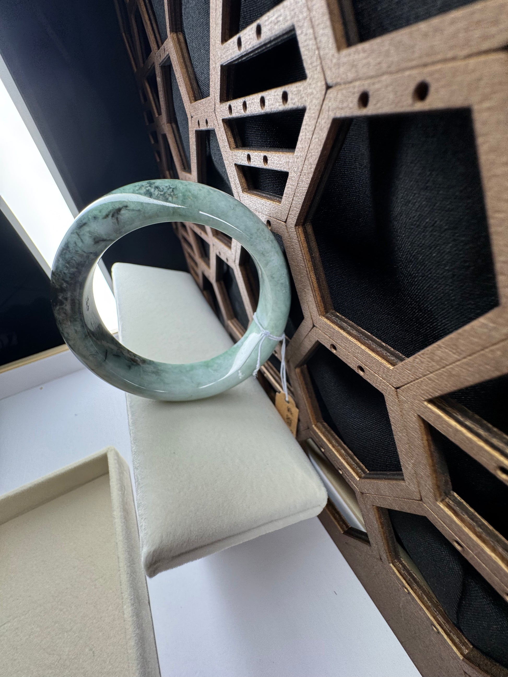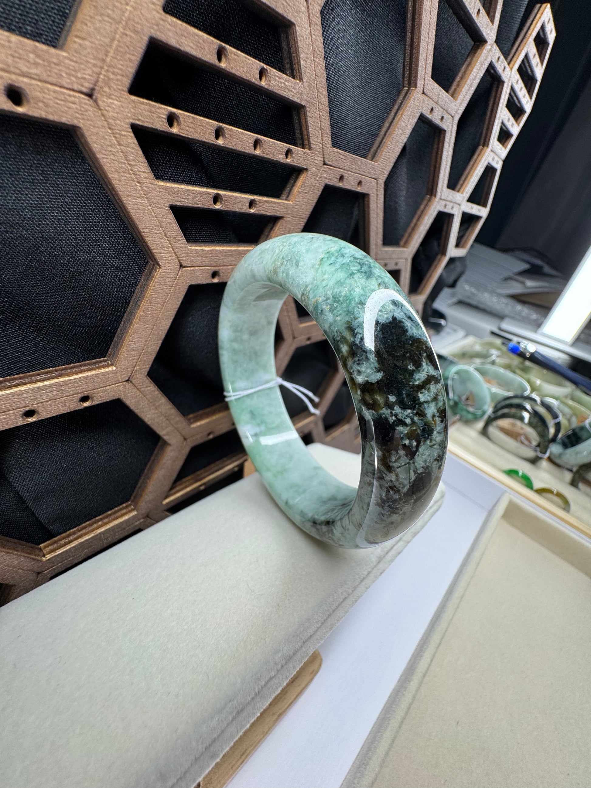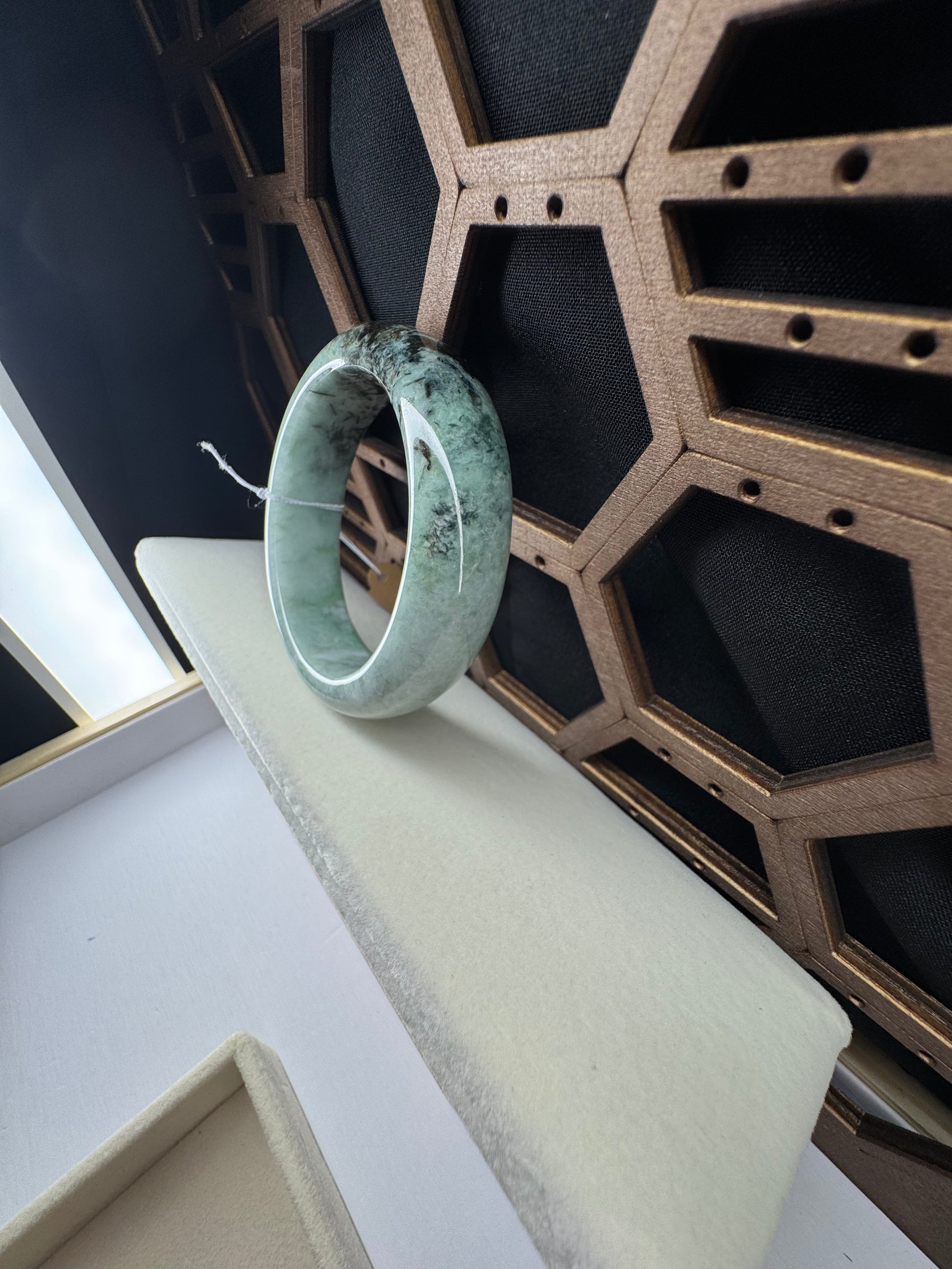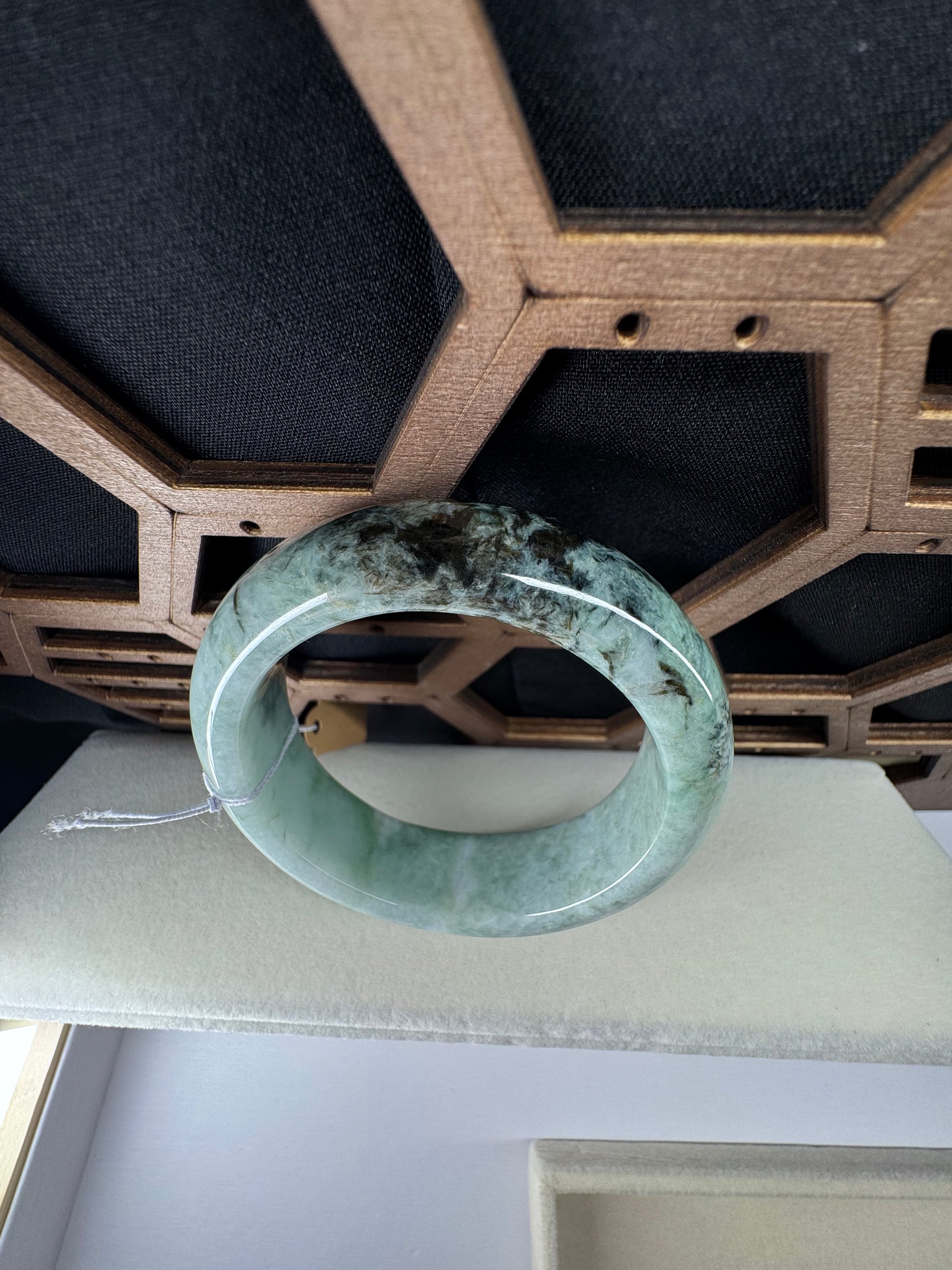 This bangle is made with genuine Burmese old mine Jadeite jade, The jade texture is very smooth and translucent with forest green color inside. The green color looks very nice with some clouds. It's a very unique color bangle. You know the genuine jade bangle is always meaningful for someone. It's a Classic half round comfort style bracelet. It's a special gift for yourself or your love.