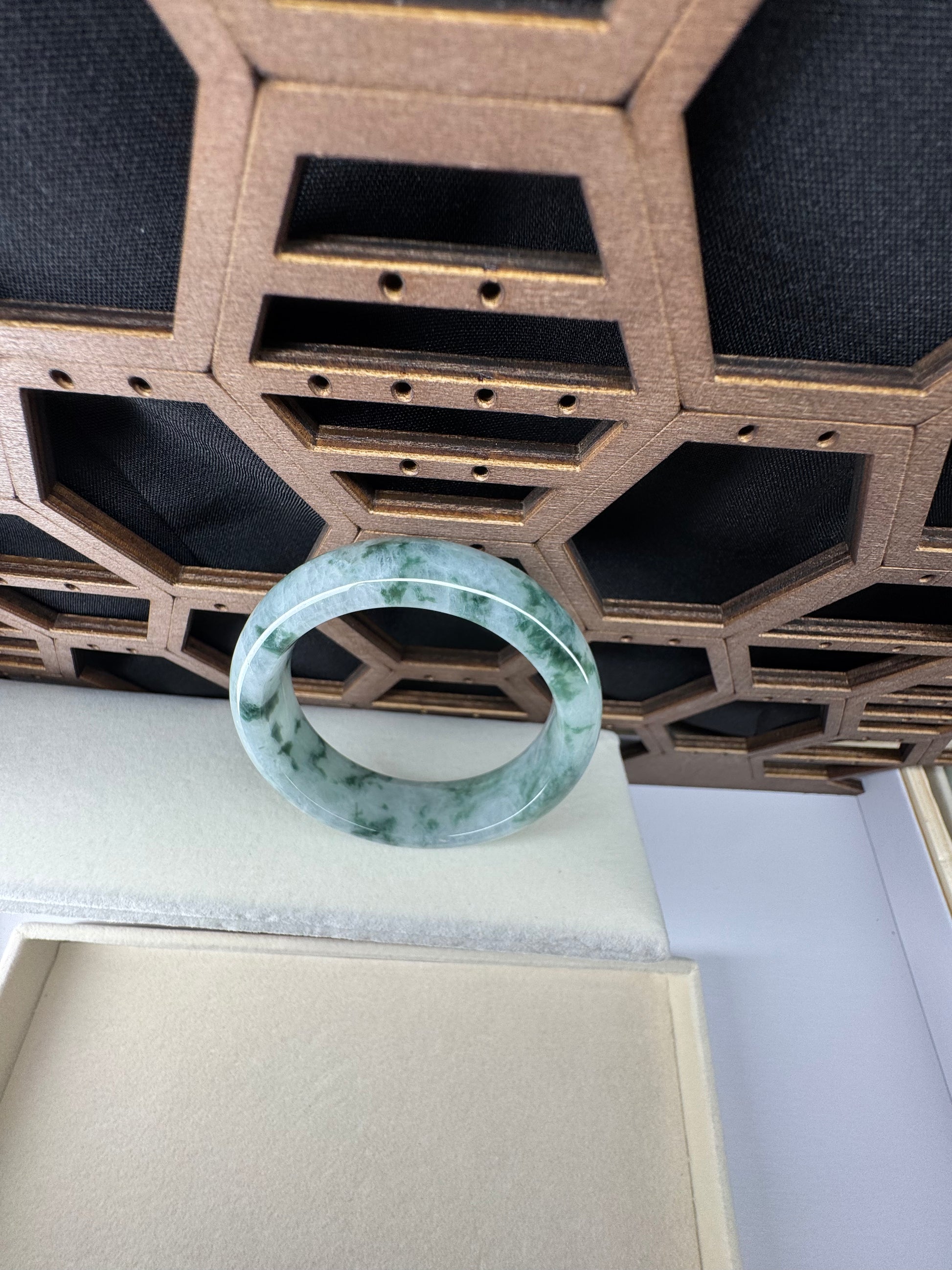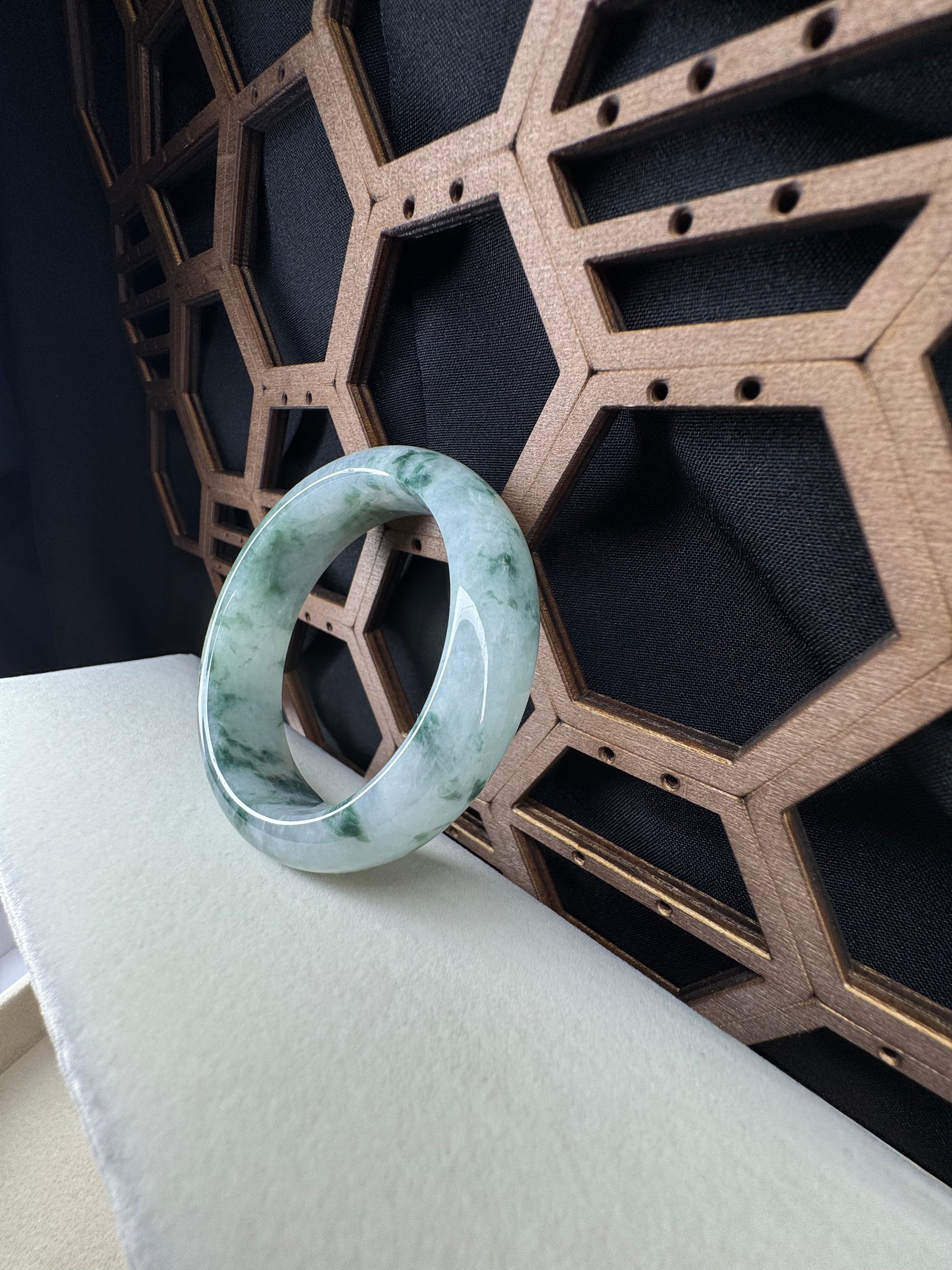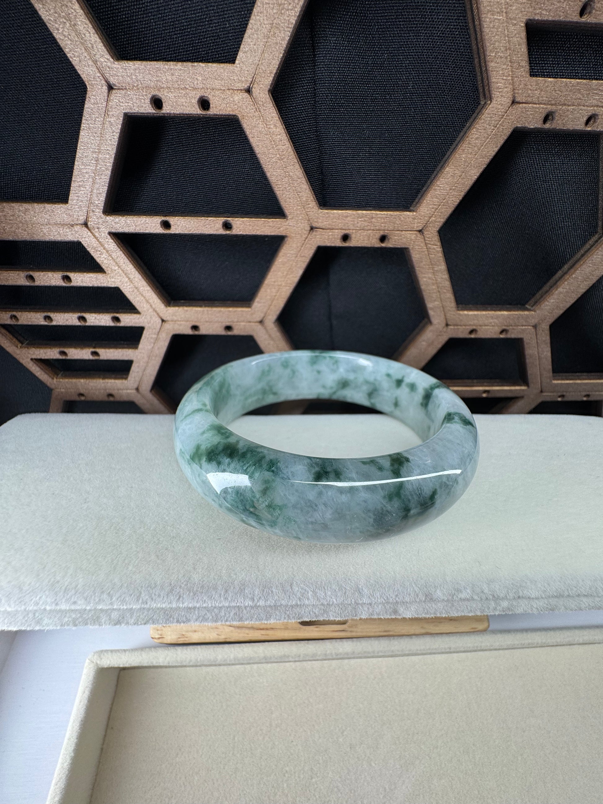 This bangle is made with Burmese icy green with floating flowers jadeite jade. This bangle is made with old mine and is wider and heavy. The jade texture is very smooth with green color. It's a oval style for a lovely small hand. You know the genuine jade bangle is always meaningful for someone. It's a special gift for yourself and your love.