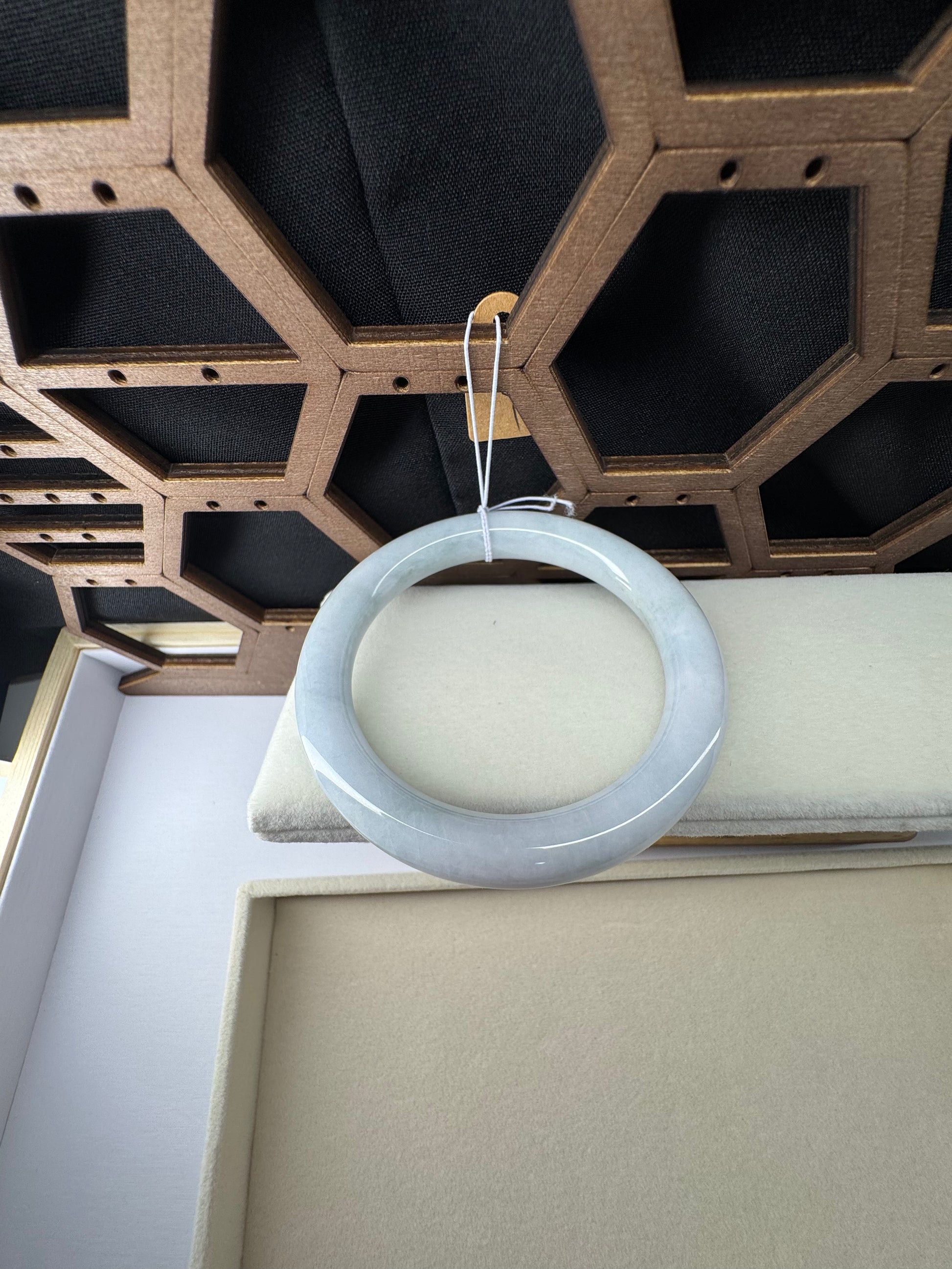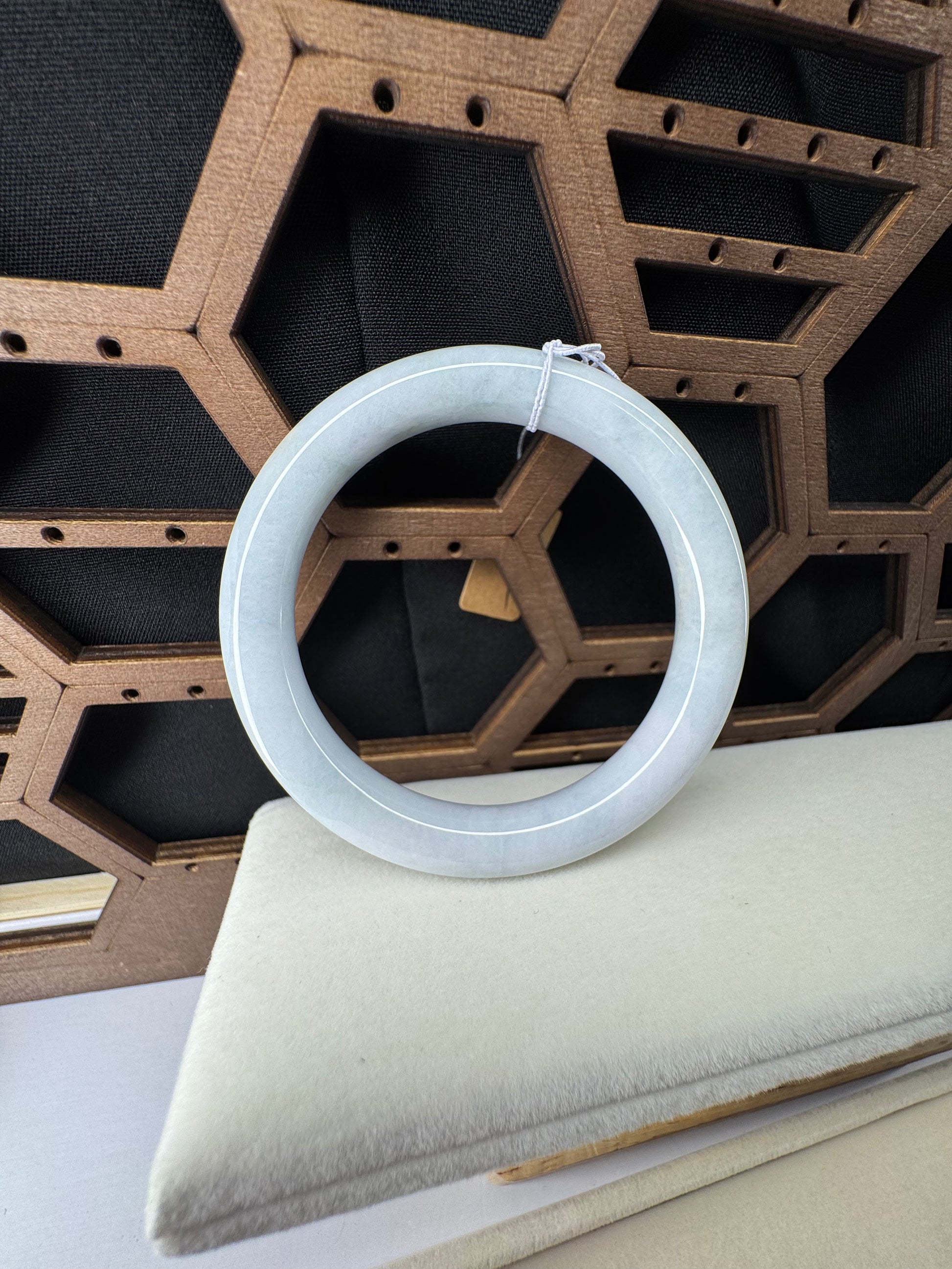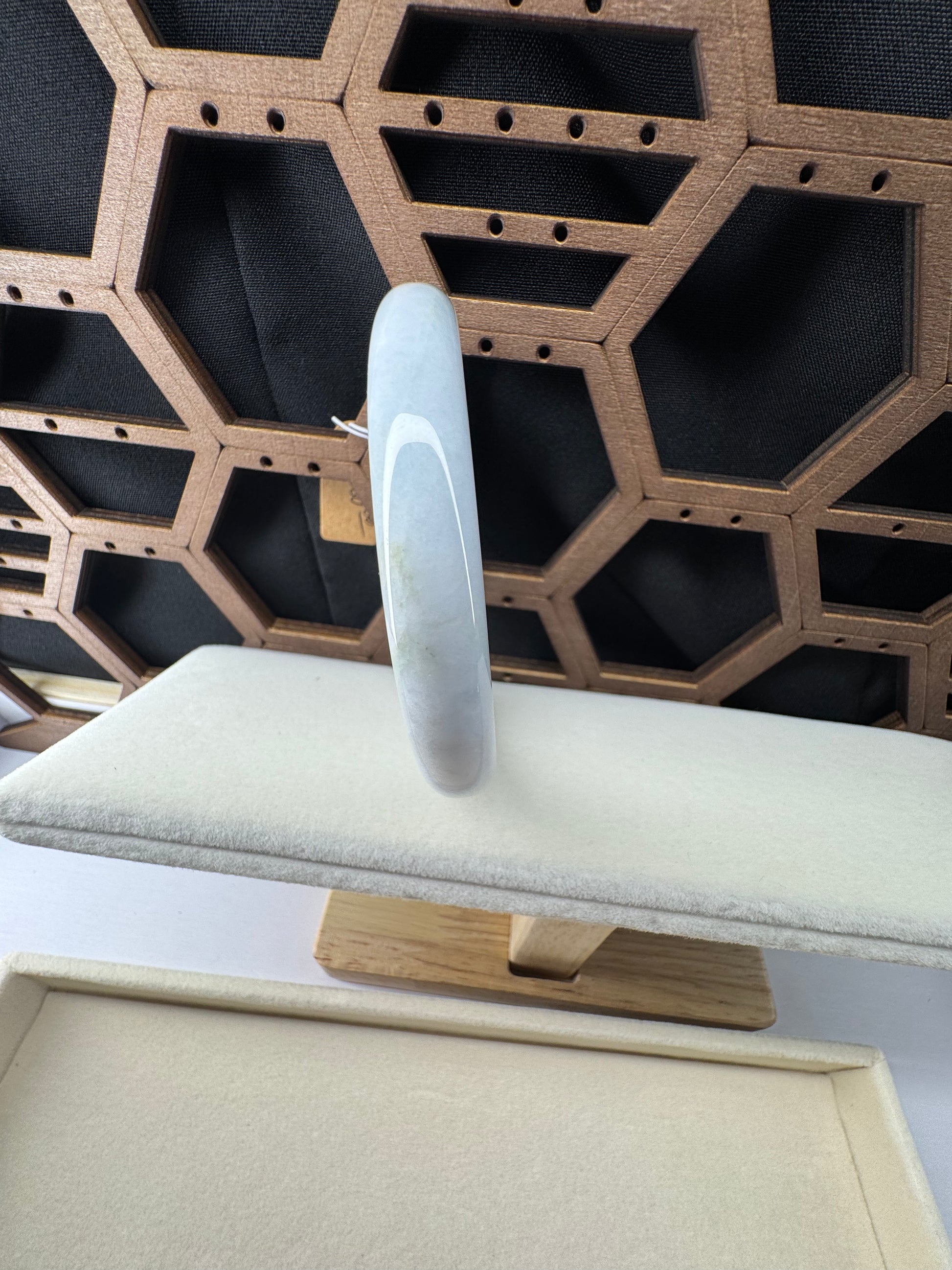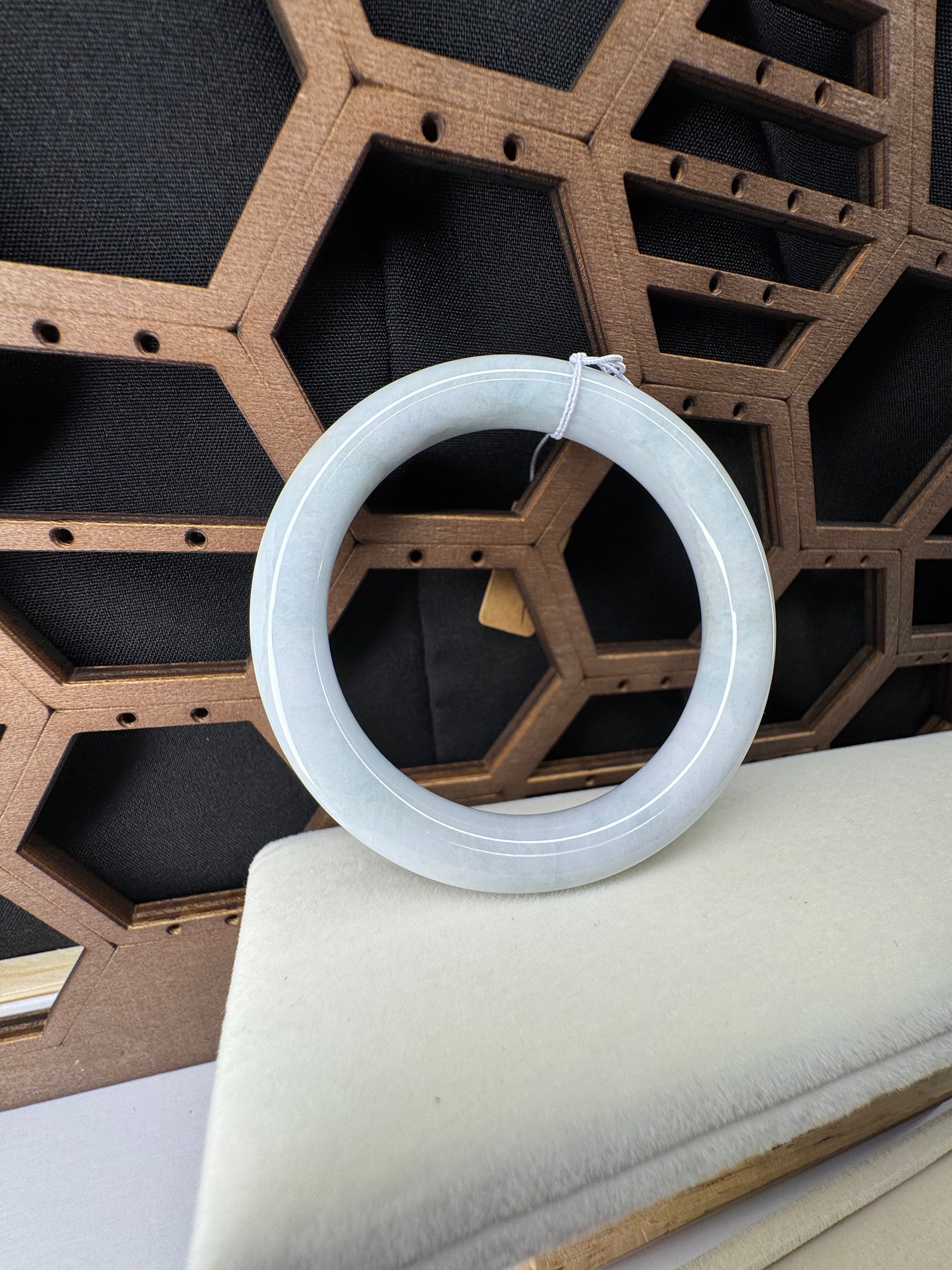 White Genuine Burmese Jadeite Jade Bangle. The jade texture is relatively fine with some patches of light lavender and white colors throughout. The texture is smooth and fine. The color is truly mesmerizing. The Classic round style bracelet is comfortable. It's a wider and heavy bangle. It's a unique gift for yourself or your love.