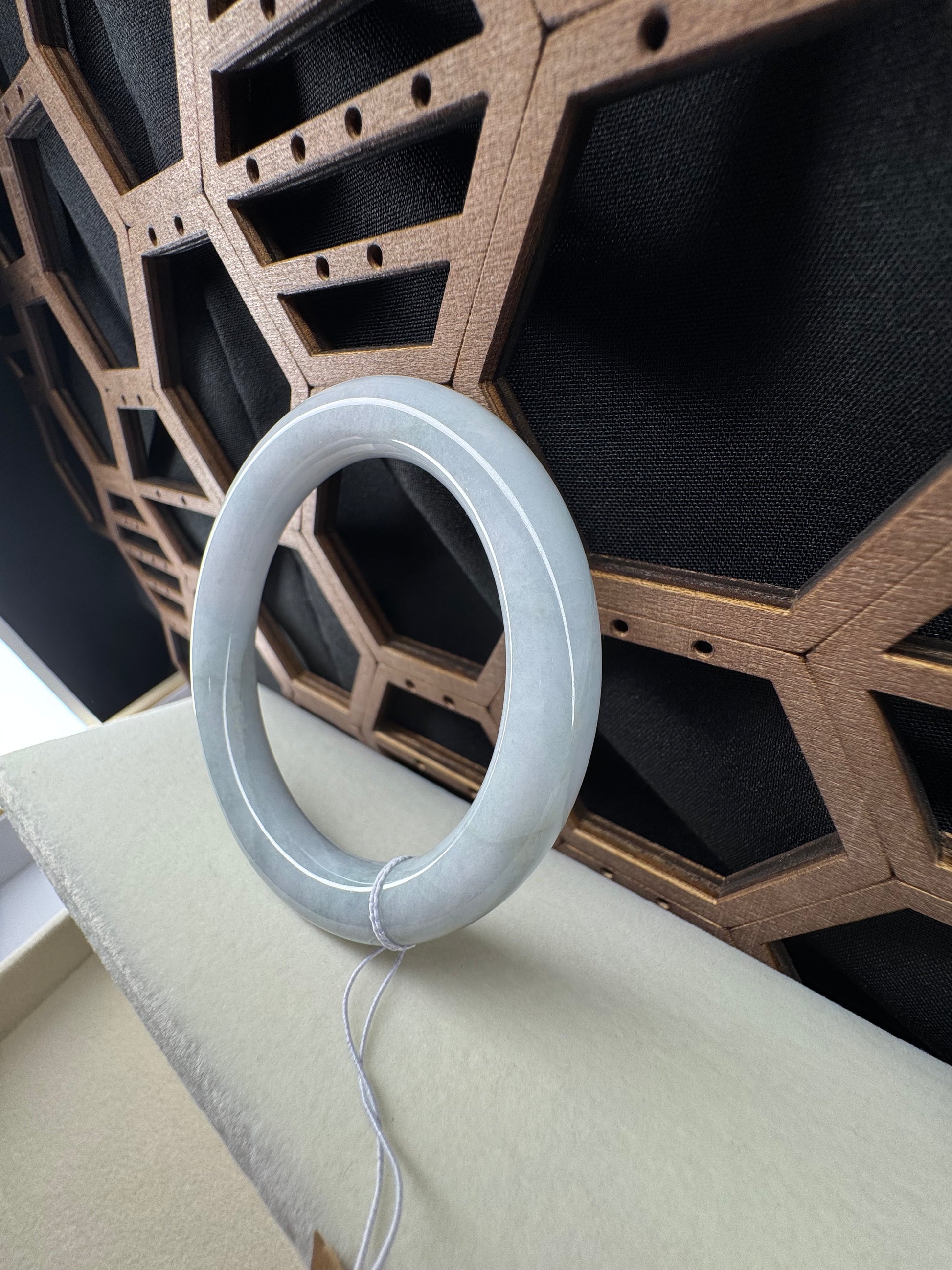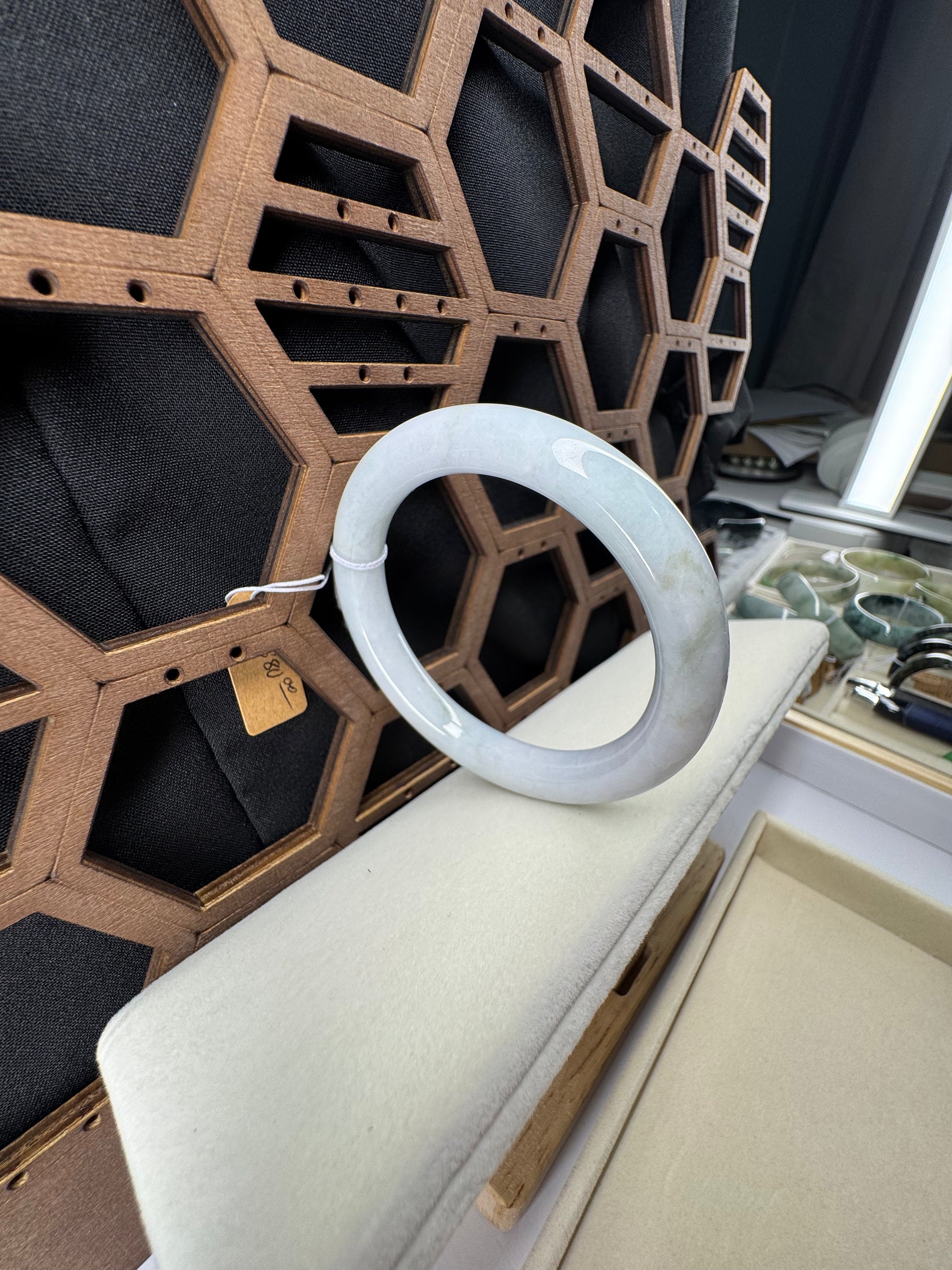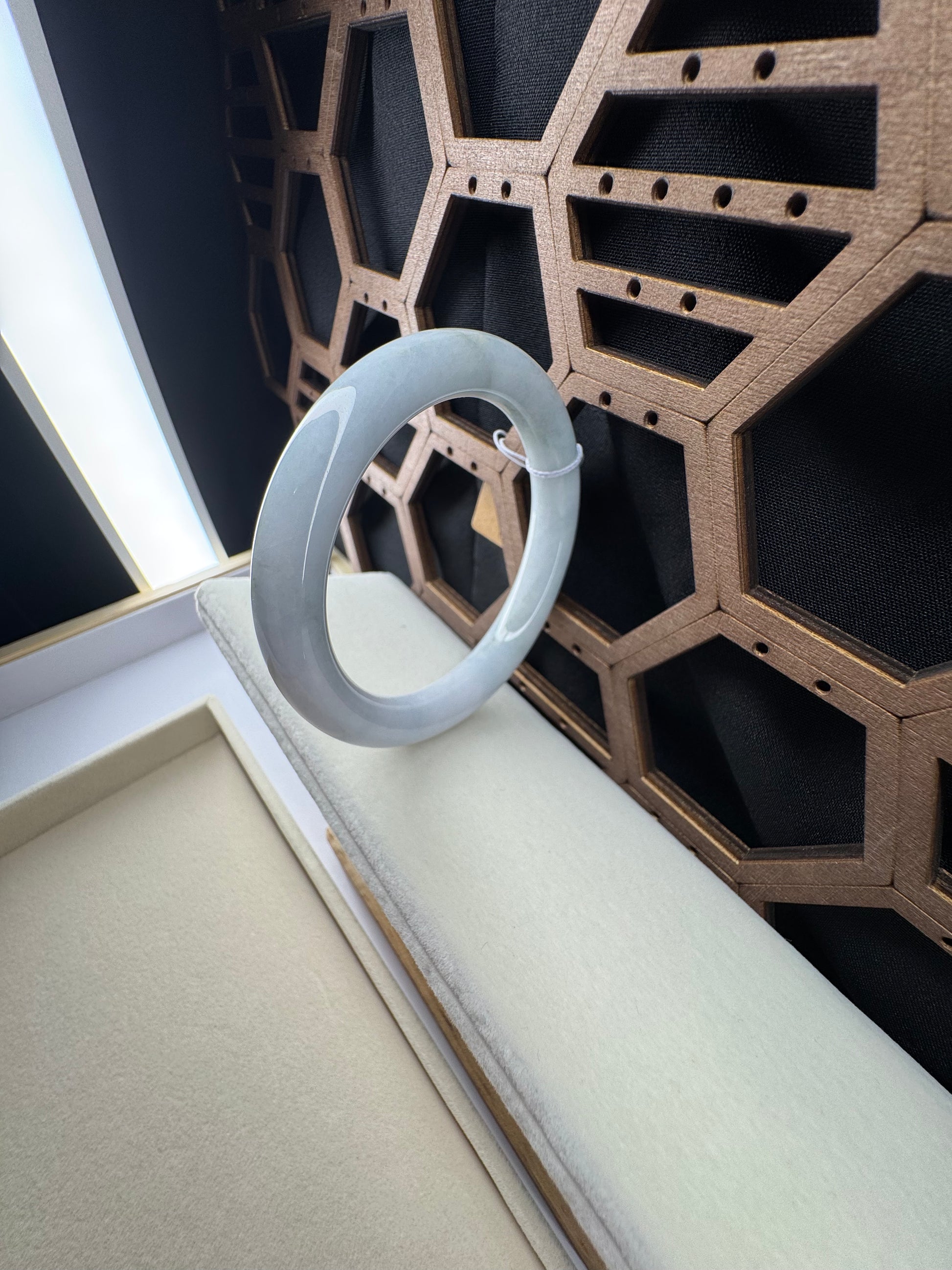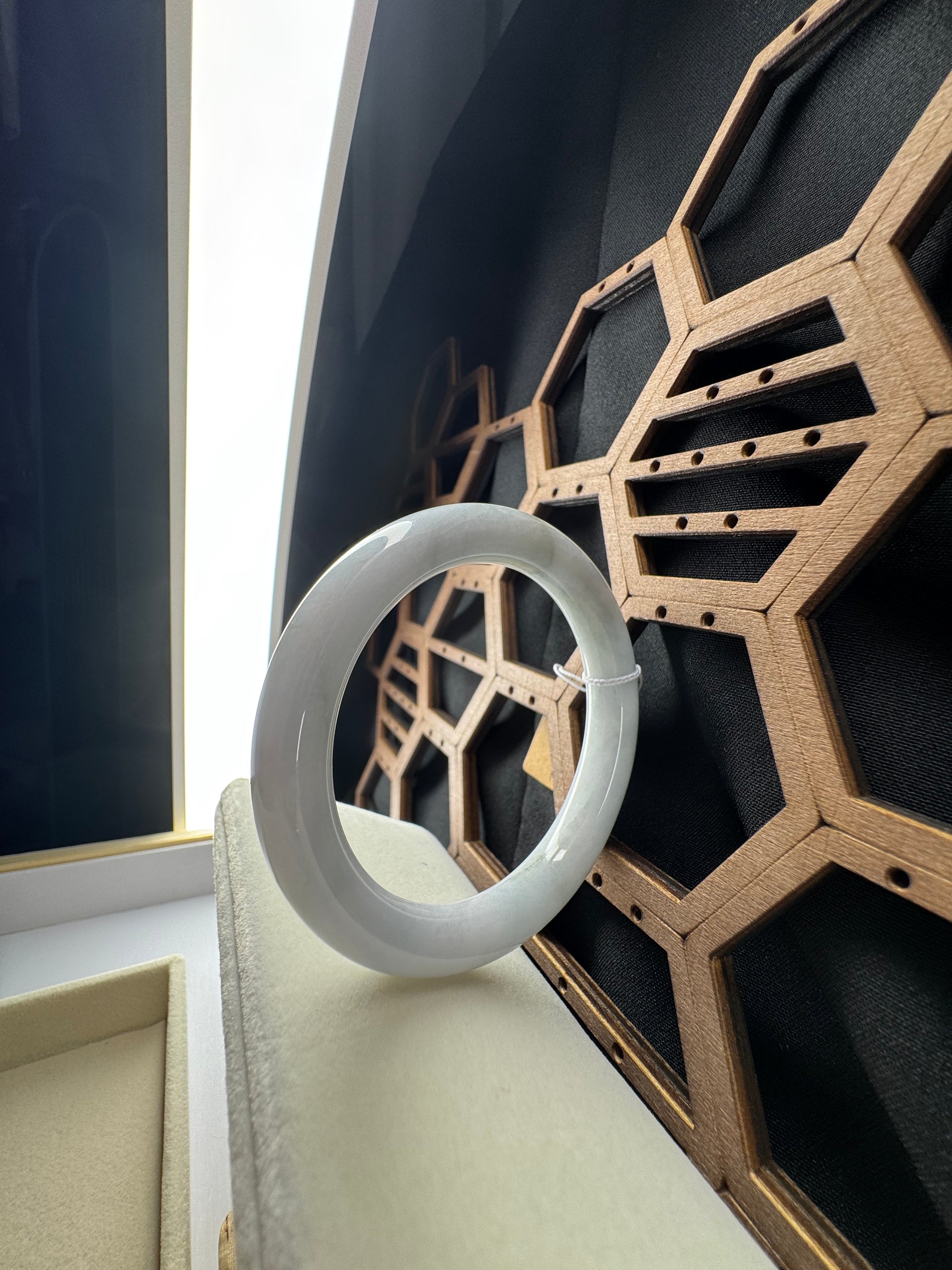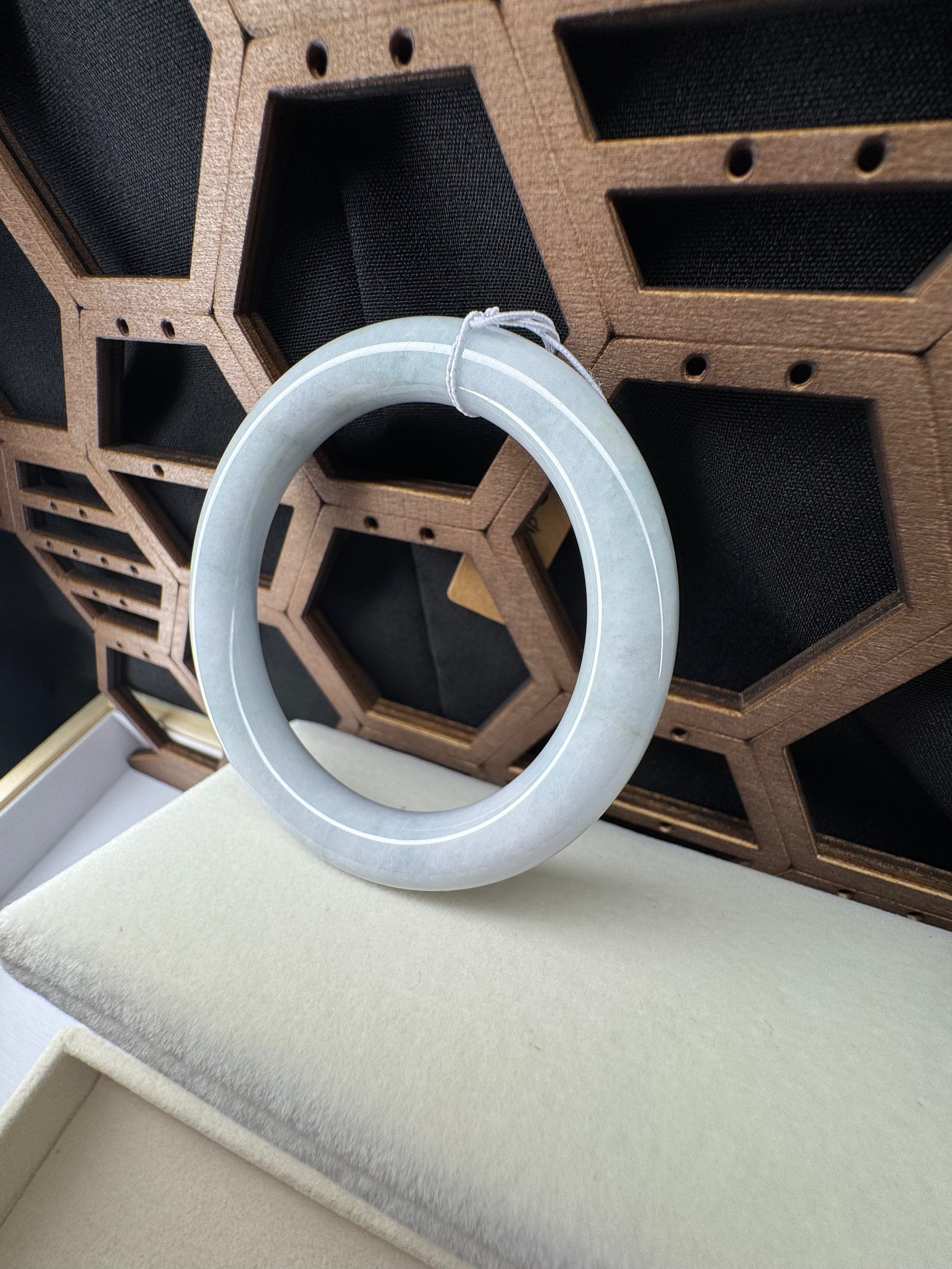White Genuine Burmese Jadeite Jade Bangle. The jade texture is relatively fine with some patches of light lavender and white colors throughout. The texture is smooth and fine. The color is truly mesmerizing. The Classic round style bracelet is comfortable. It's a wider and heavy bangle. It's a unique gift for yourself or your love.