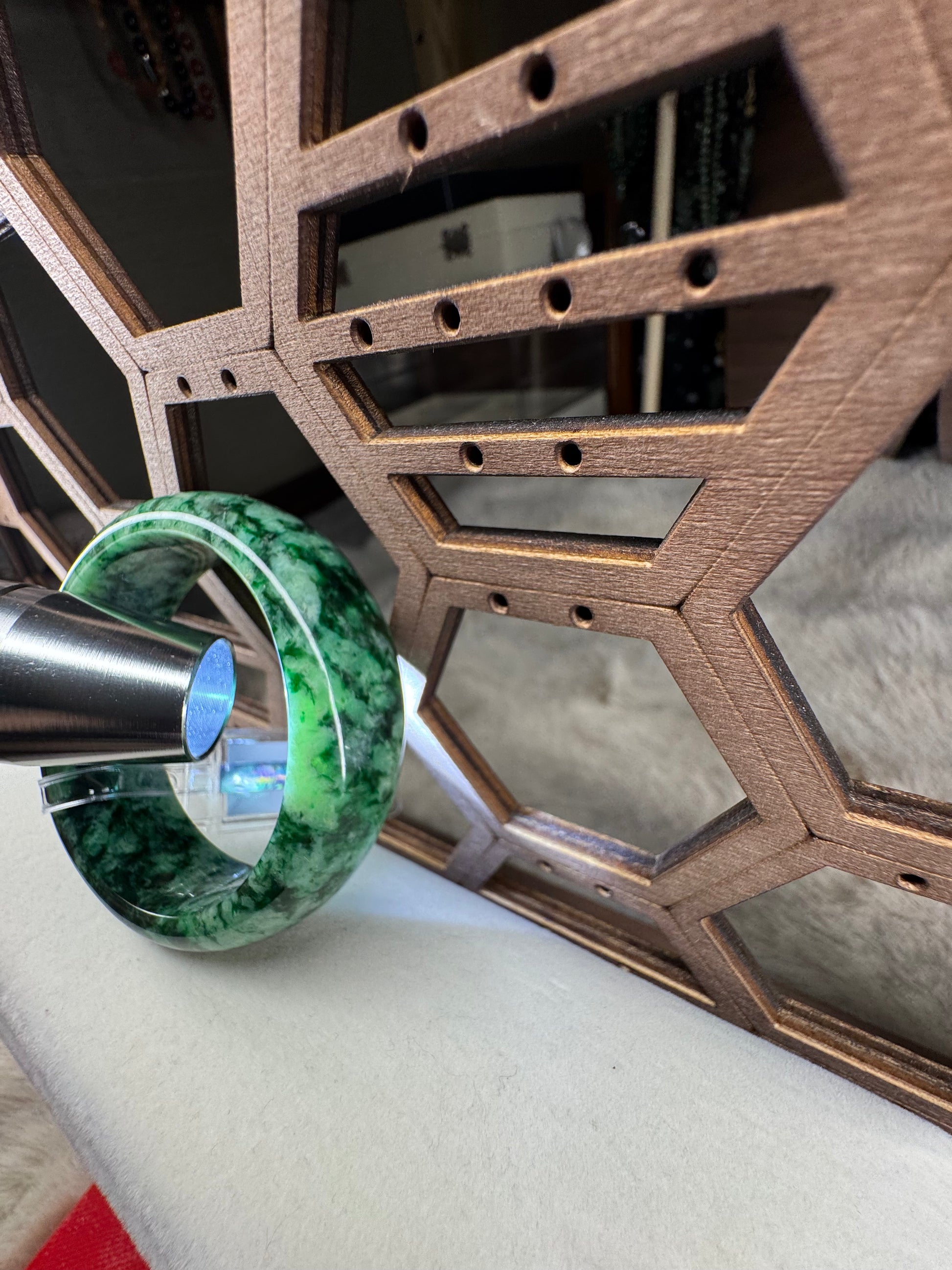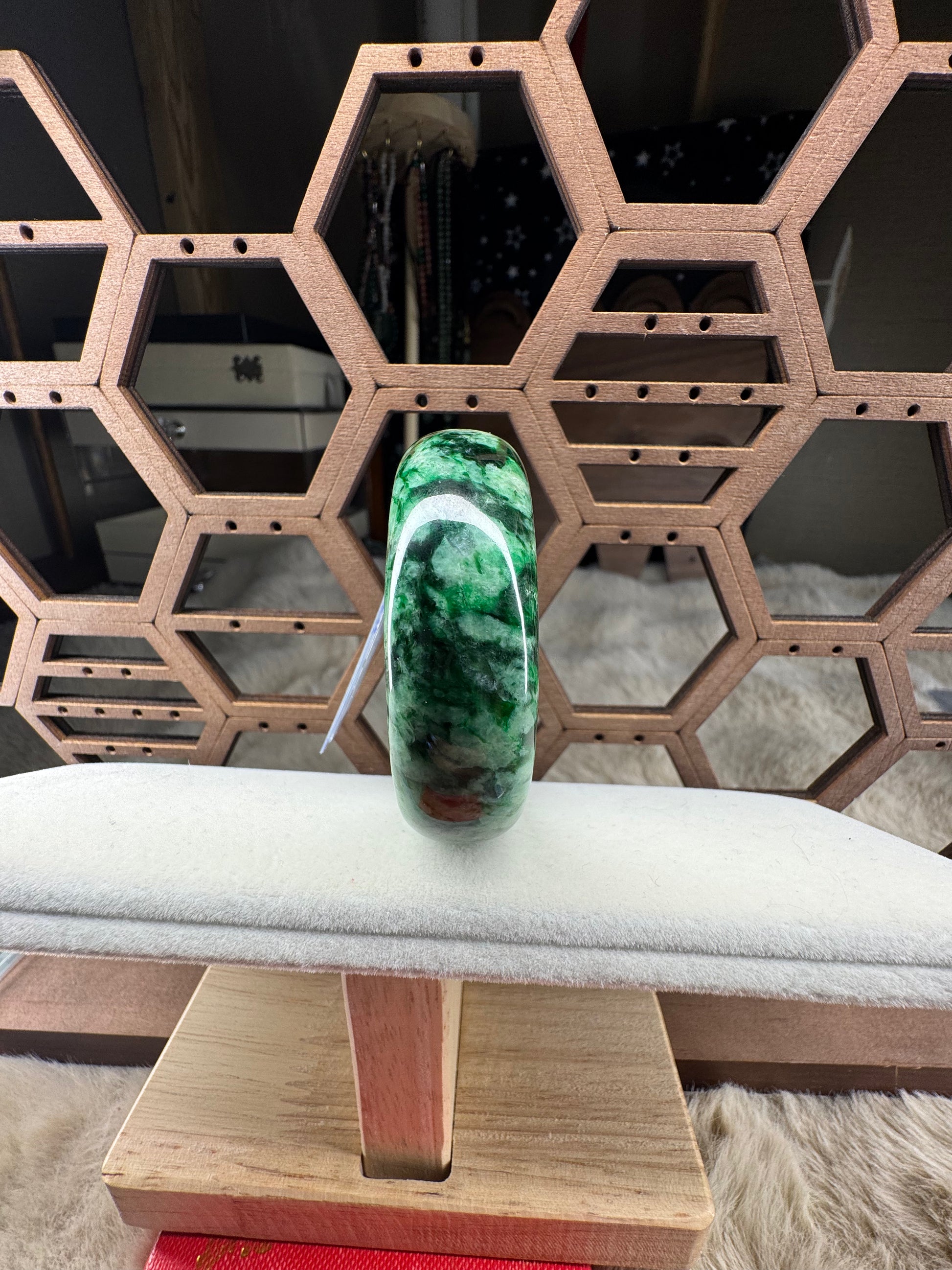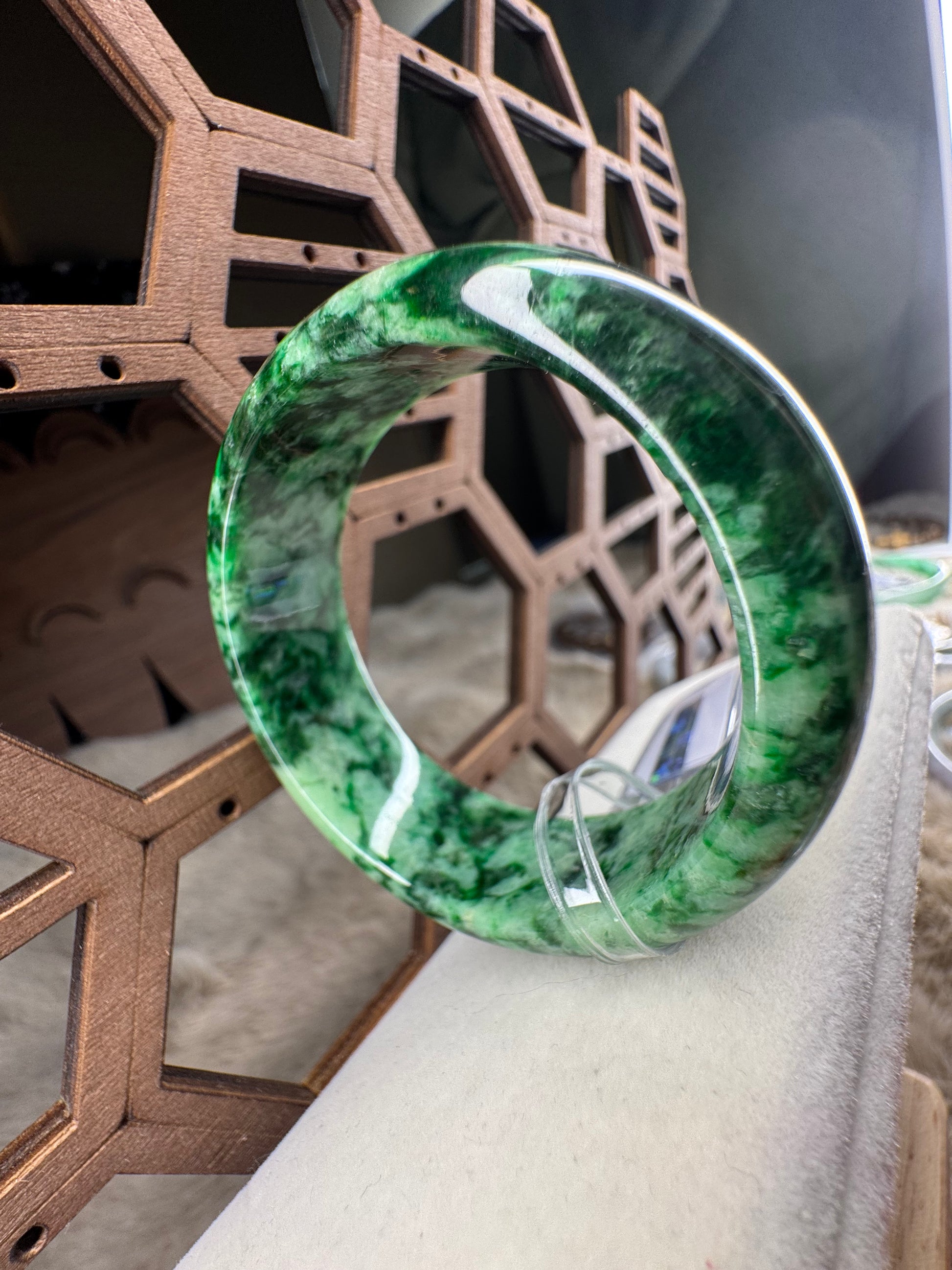 Being called mountain and water jadeite Jade is very rare find. The bangle stunning with bright green blends with dark and lighter green.