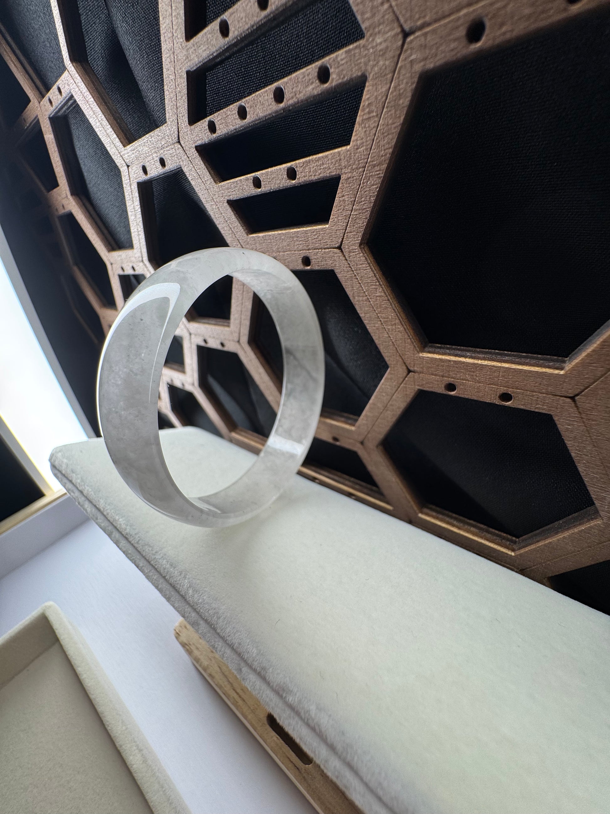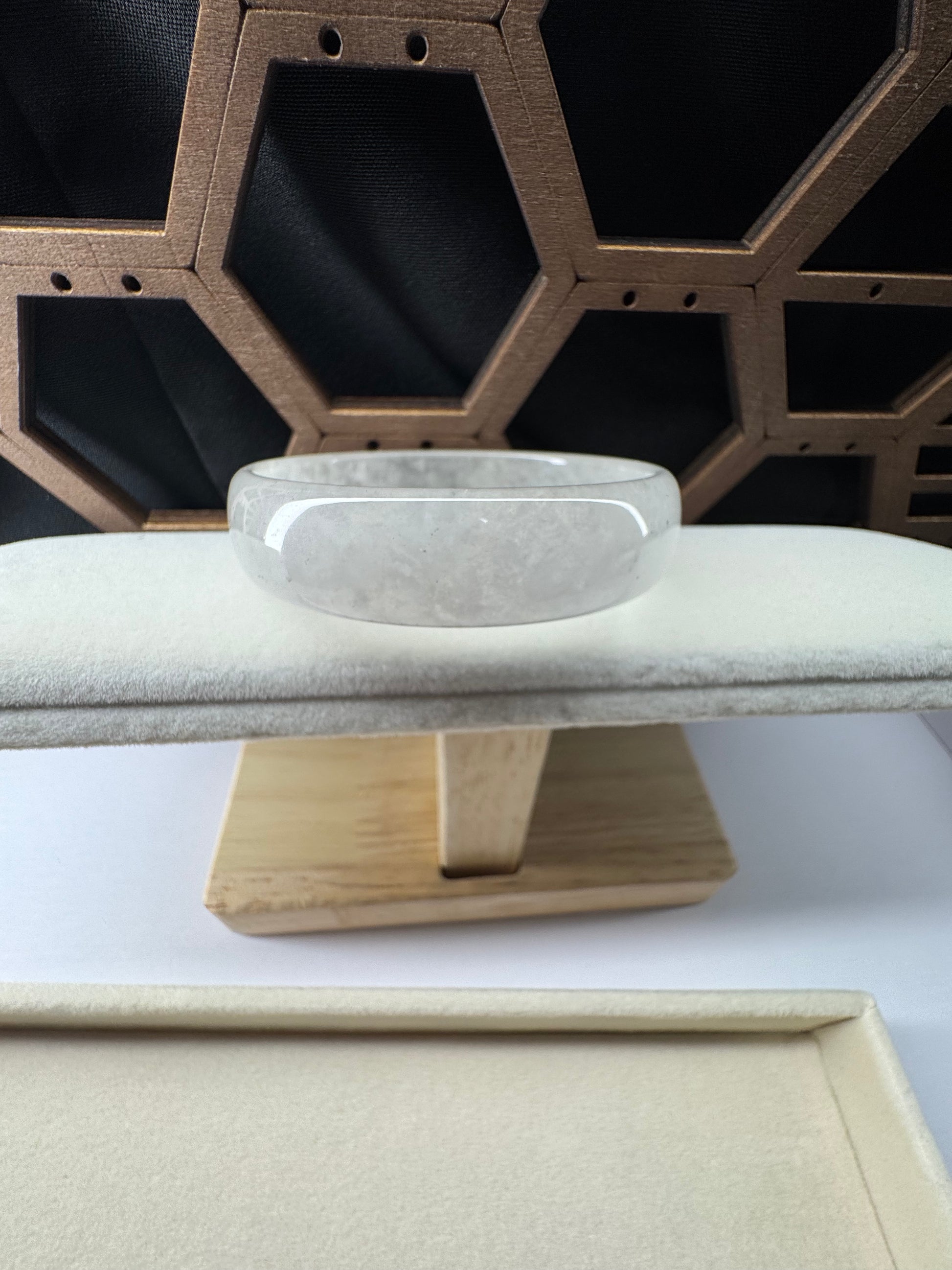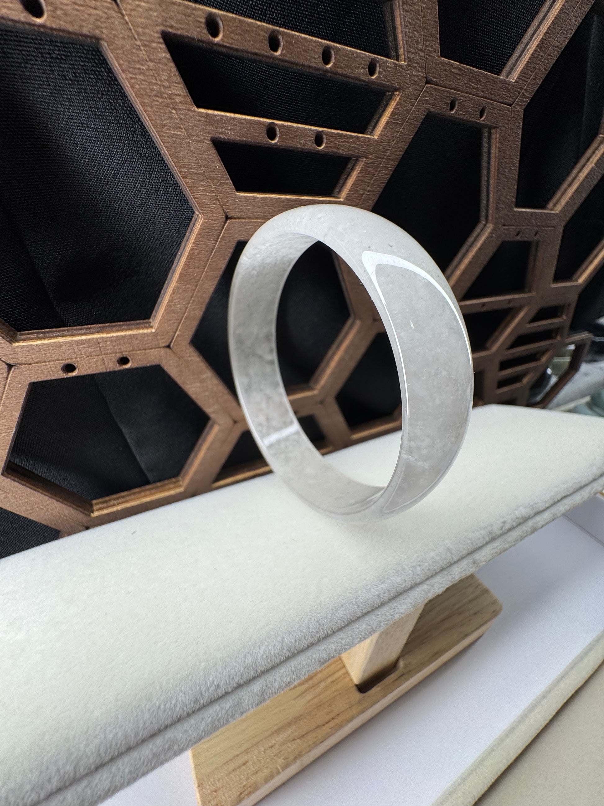Very unique icy white jade with black pepper flakes running lightly around the bangle.