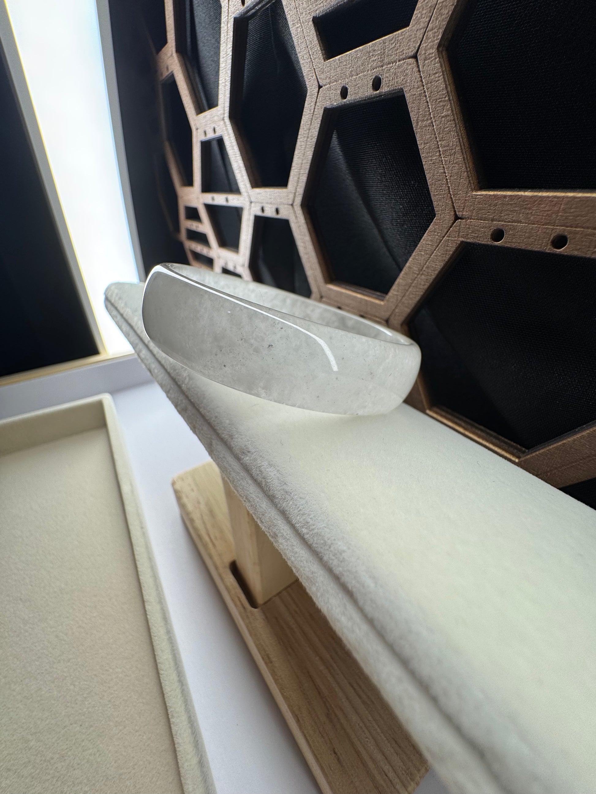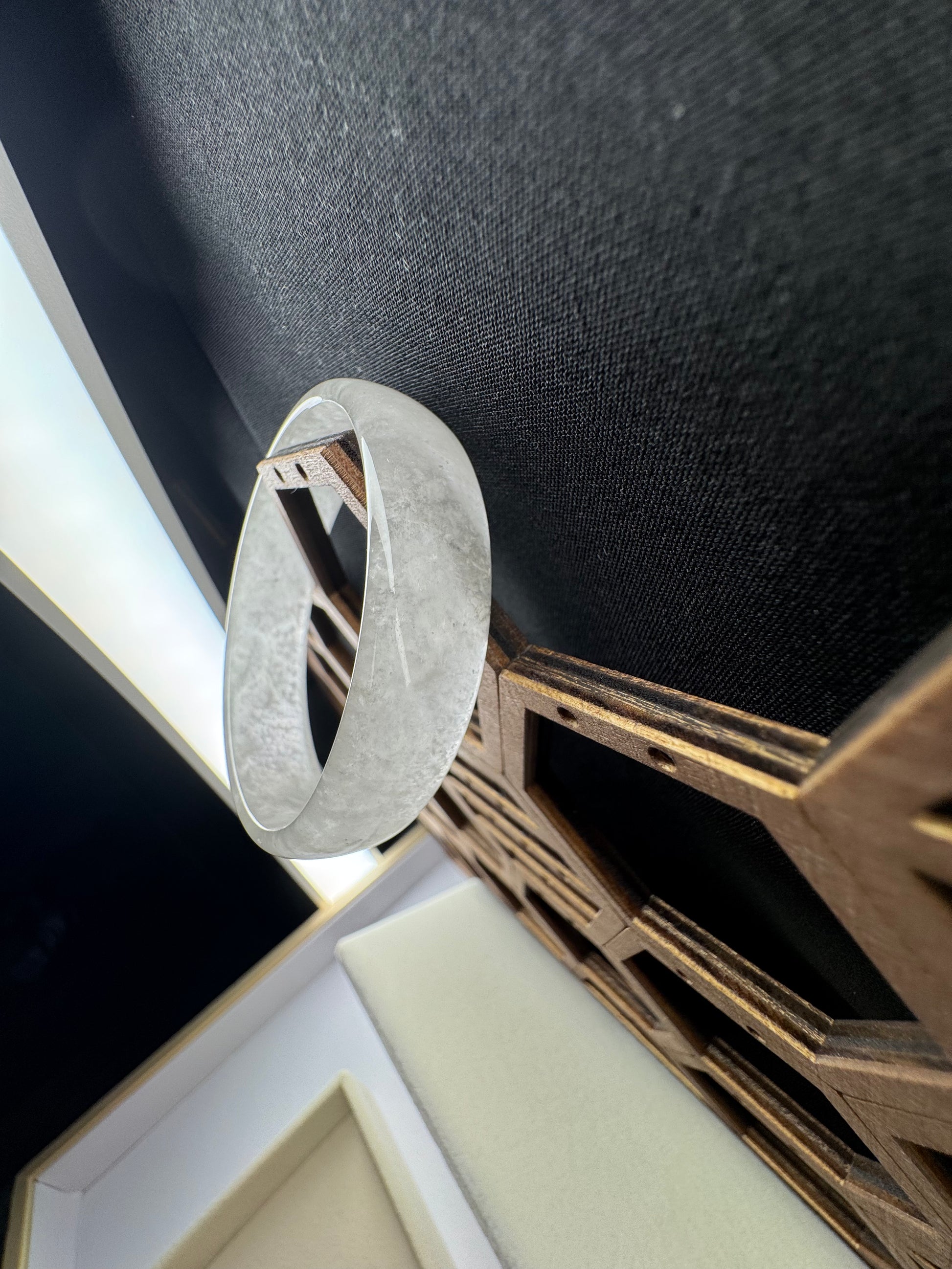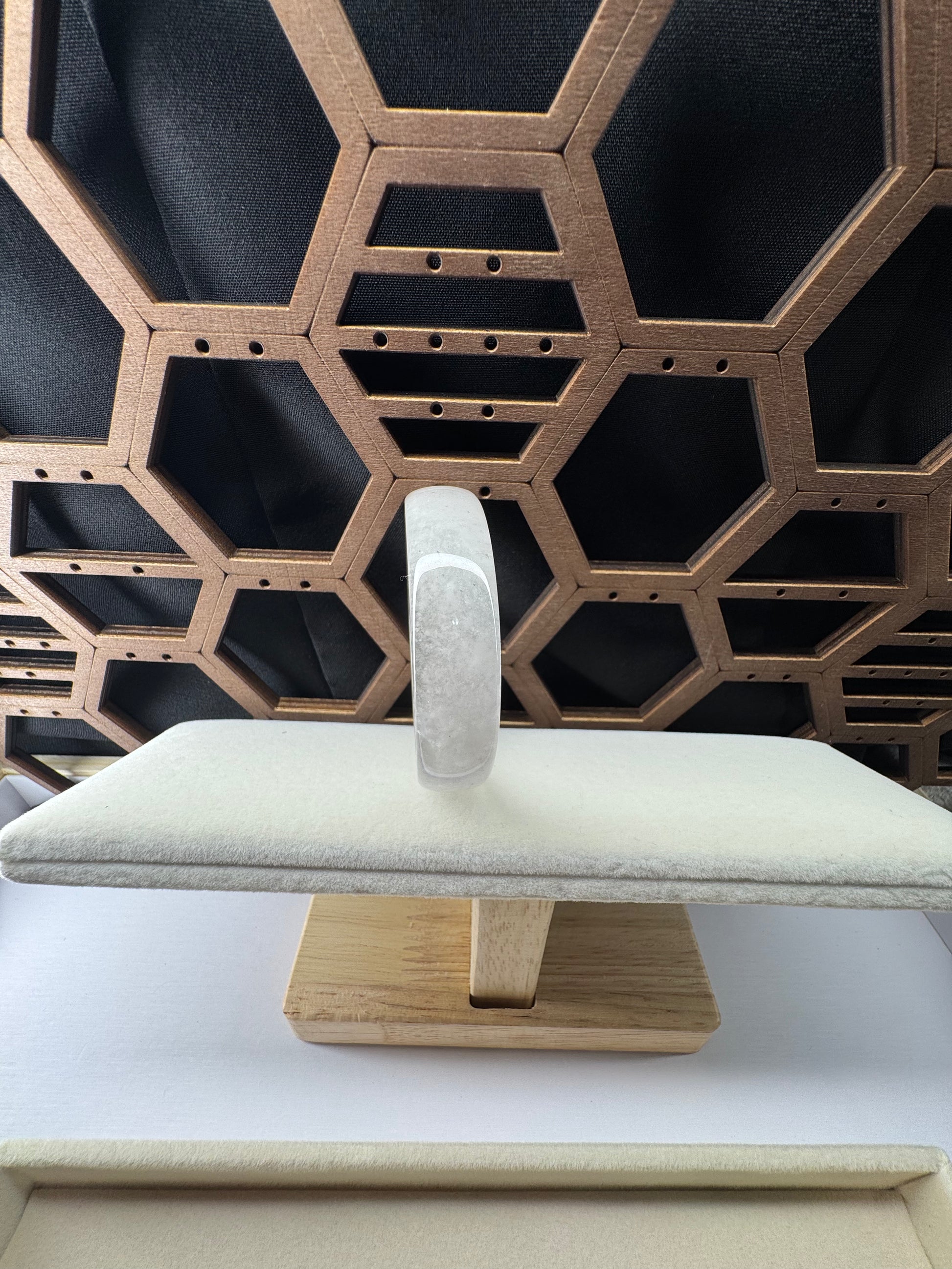 Very unique icy white jade with black pepper flakes running lightly around the bangle.